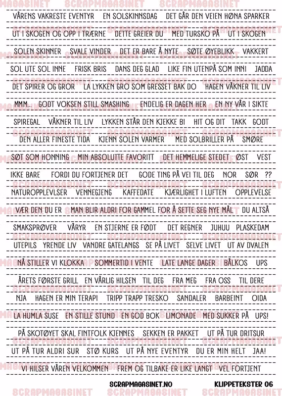 Klippetekster 06 - Vårens vakreste eventyr- hvit A4 A4 ark med tekster som vist. 250gr. På lager Legg i handlekurv Lagerbalanse: 71 Del Informasjon A4 ark med tekster som vist. 250gr.